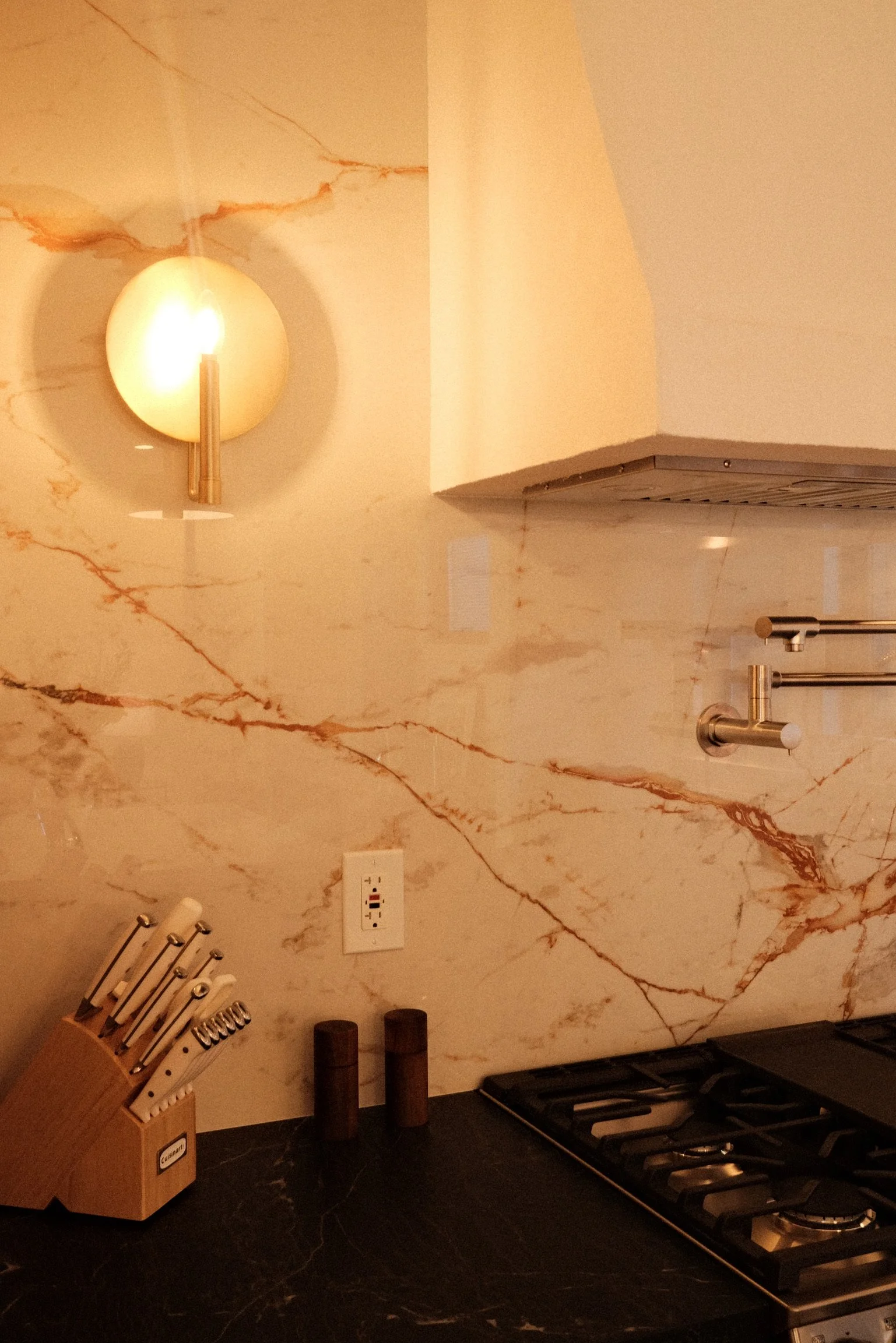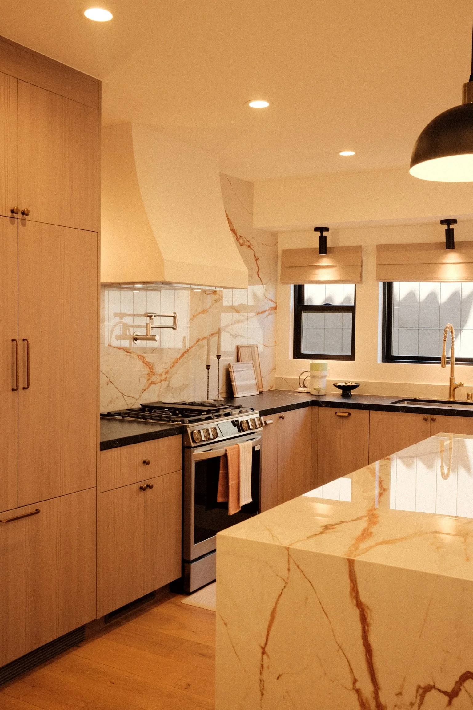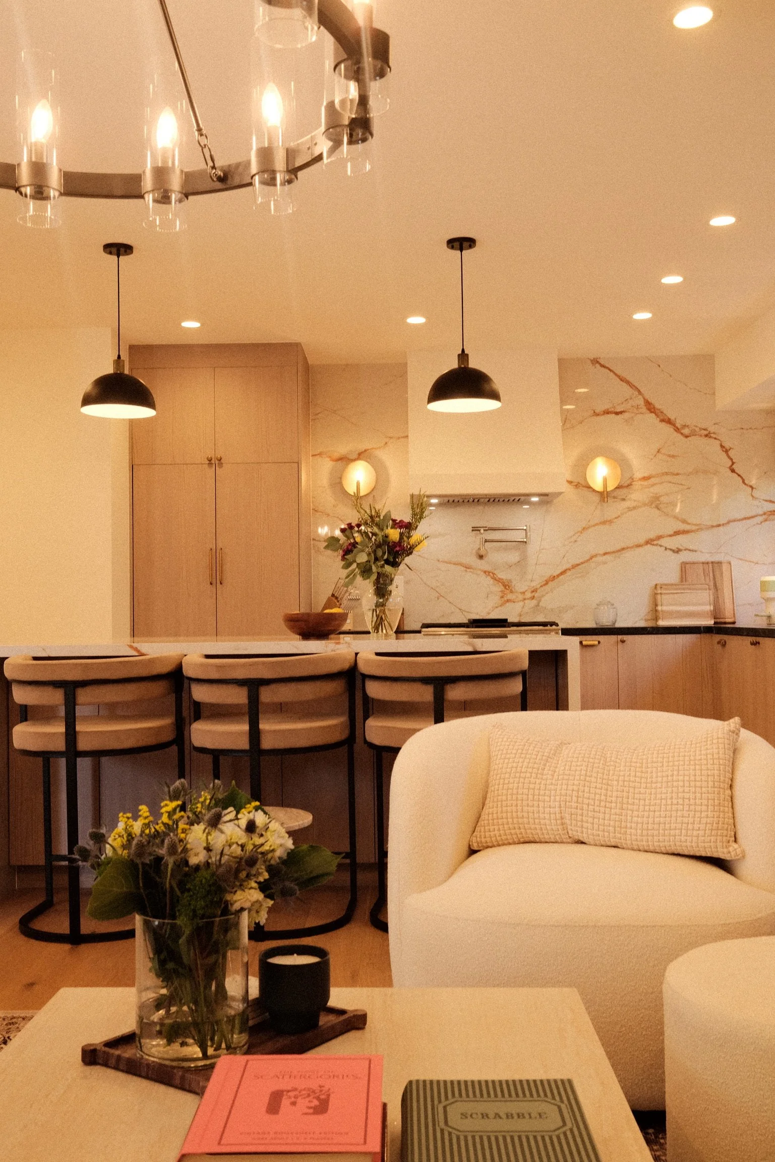 The curated blend of heritage and modern restraint. We layered custom millwork, artisan tile, natural stone, and sculptural lighting to create a home that feels timeless, tactile, and livable. In the kitchen, dramatic Constentino marble slabs and integrated lighting elevate functionality into form, while the living room centers around a custom plaster fireplace and layered textures. The moody, color-drenched bedroom acts as a cocoon, contrasting the sunlit palette elsewhere. Every material from imported Italian stair tile to handcrafted Zellige in the baths was selected for longevity, soul, and spatial harmony. Designed with a sharp eye and a high standard, this project reflects our belief that luxury lies in intention, not excess.